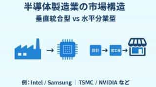半導体半導体製造業の市場構造を解説:垂直統合型 vs 水平分業型の移行 半導体製造業の市場構造を概説。垂直統合型(Intel, Samsung)と水平分業型(NVIDIA, TSMC)の違い、移行の理由、チップレットによる中工程の未来を解説。半導体業界のビジネスモデルをざっくり理解したい方に最適。 2025.10.26半導体