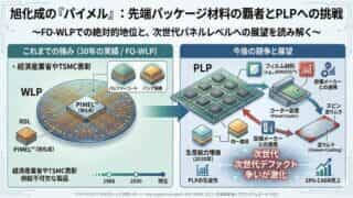 半導体パイメル(PIMEL)とは?旭化成の先端半導体材料の強みとPLPへの展望 旭化成の半導体製造向け感光性絶縁材料「パイメル(PIMEL)」について、現役エンジニアが徹底解説。先端半導体(FO-WLP)で採用される理由から、次世代パッケージ(PLP)に向けた富士フイルム「ZEMATES」ら競合との覇権争いまで、今後の展望を分析します。 2026.03.01半導体