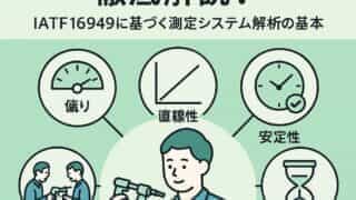 品質管理MSA(測定システム解析)の5つの評価をざっくり解説!【IATF16949】 ATF16949で求められるMSA(測定システム解析)の5つの評価(偏り、直線性、安定性、GR&R)をわかりやすく解説。測定の正確性や評価の意味を初心者向けにまとめました。 2025.05.06品質管理統計