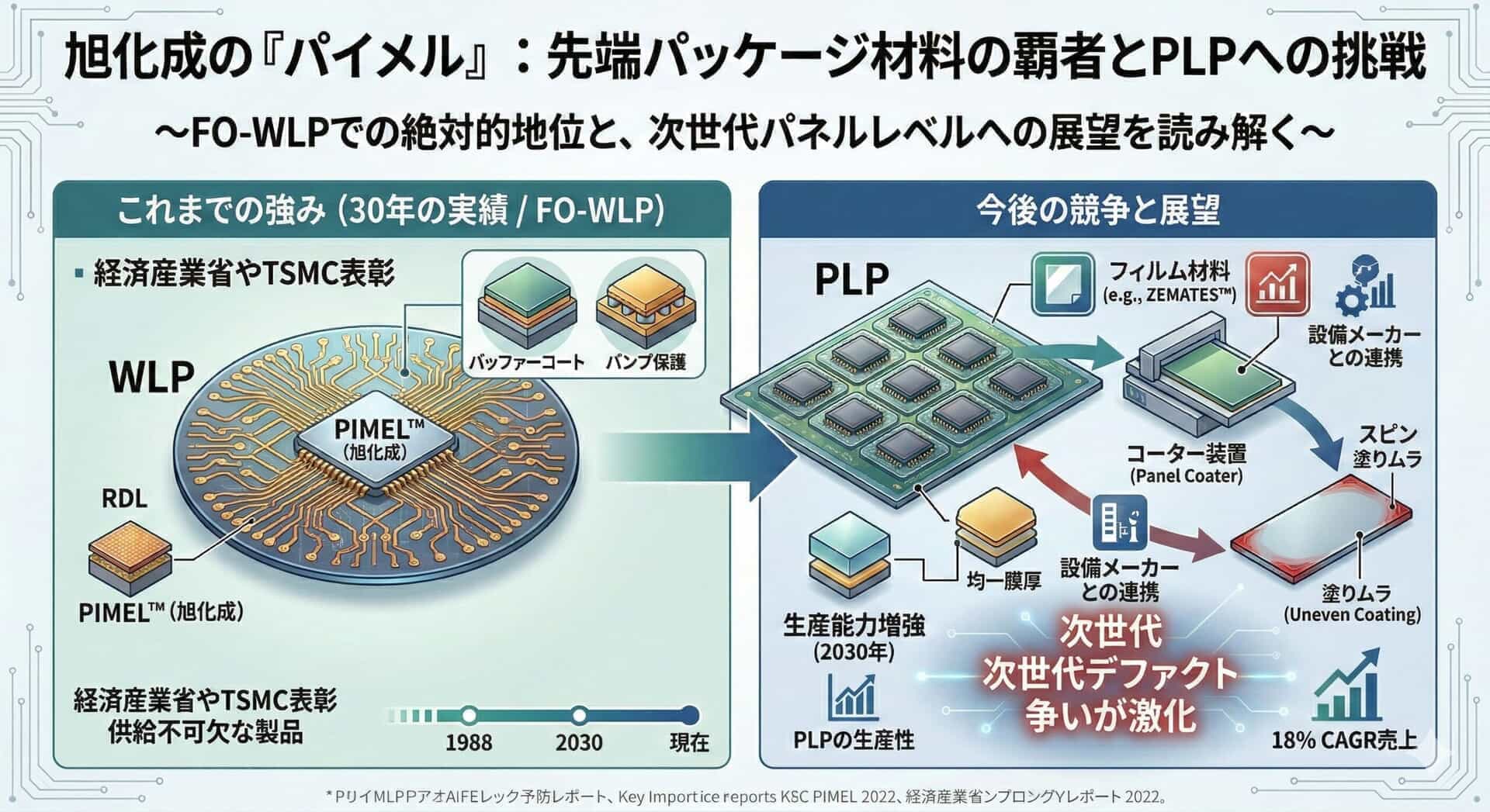 本記事では、先端半導体パッケージの再配線(RDL)用感光性材料である、旭化成のパイメル(PIMEL)について、半導体材料の製造と開発に携わって3年になる筆者が解説をします。パイメルは先端半導体になくてはならない存在となっており、供給が不足により、一時先端半導体の製造が停止に追い込まれかねない事態にまでなりました(引用1)。