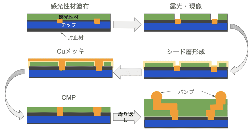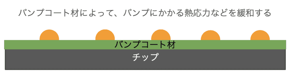 第二の理由は、再配線層用の材料として転用に成功したためです。再配線層用の材料として使われるに至った最初の転換点は、バンプコート材としての採用と考えられます(引用2)。バンプコートとは、フリップチップと呼ばれる、チップの下面に凸型の配線(バンプ)を持つタイプのチップで、熱膨張などで、バンプが破損しないよう保護する絶縁材のことです。パイメルがバンプコート材として採用されたことで、チップの上面だけでなく、配線を持った下面での保護と絶縁を保つための材料としての実績を積むことが出来たと考えられます。