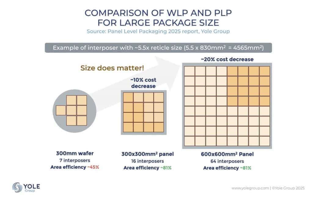 前途洋々に見えるパイメルですが、パネルレベルパッケージ(PLP)への転換が見据えられている現在、競合各社がその地位を虎視眈々と狙っています。PLPとは、これまでウェハー状にチップを配列して形成していたパッケージを、角形のパネル上にチップを配列することで生産する方式を指します。PLPの利点は、ズバリ生産性の高さです。ウェハー状に配列するWLPに比べ、同じ面積でパッケージの取れ高が大きく変わります。