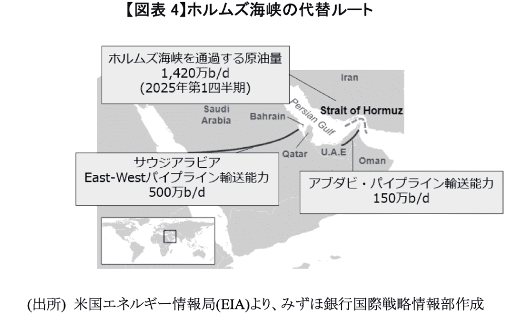 みずほ銀行が2025年7月に出したレポートに詳しいですが、中東産の原油を日本に輸出するための代替ルートは限定的です。レポートによれば、ホルムズ海峡を通る原油は毎年1500万バレル/年であり、代替ルートである石油パイプラインの輸送能力は合計650万バレル/年です。代替ルートによるホルムズ海峡の回避は不可能であると言えます。