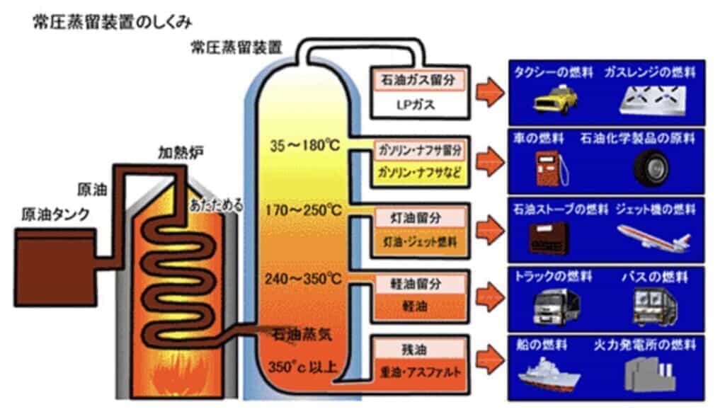 です。ホルムズ海峡が閉鎖される事によって、日本の原油とナフサの輸入が大きな影響を受けていることを先ほど示しました。原油は精製されることでガソリンや灯油、ナフサ、重油などに変わります(引用3)。