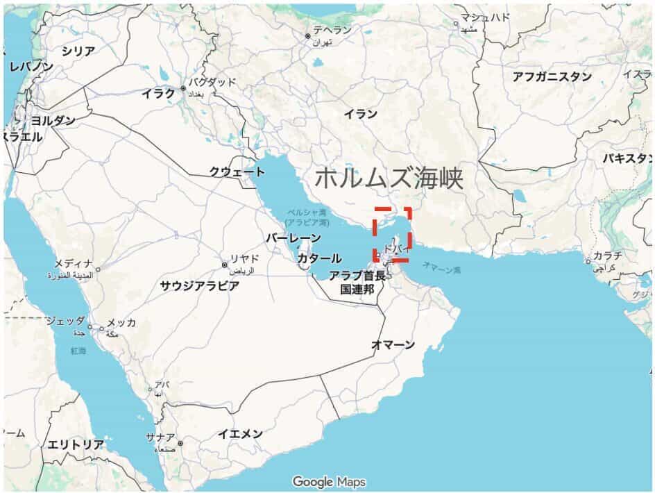 前提として、ホルムズ海峡の位置を示します。ホルムズ海峡は、ペルシャ湾とオマーン湾をつなぐ幅40 kmほどの海峡です。オマーンとイランとの間に位置しています。