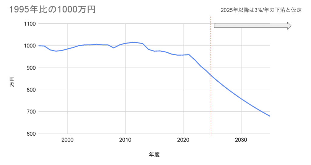 消費者物価指数を元に、1000万円の価値を1995年比で見てみます。驚くことに、2025年の1000万円は、1995年の860万円と同等です。