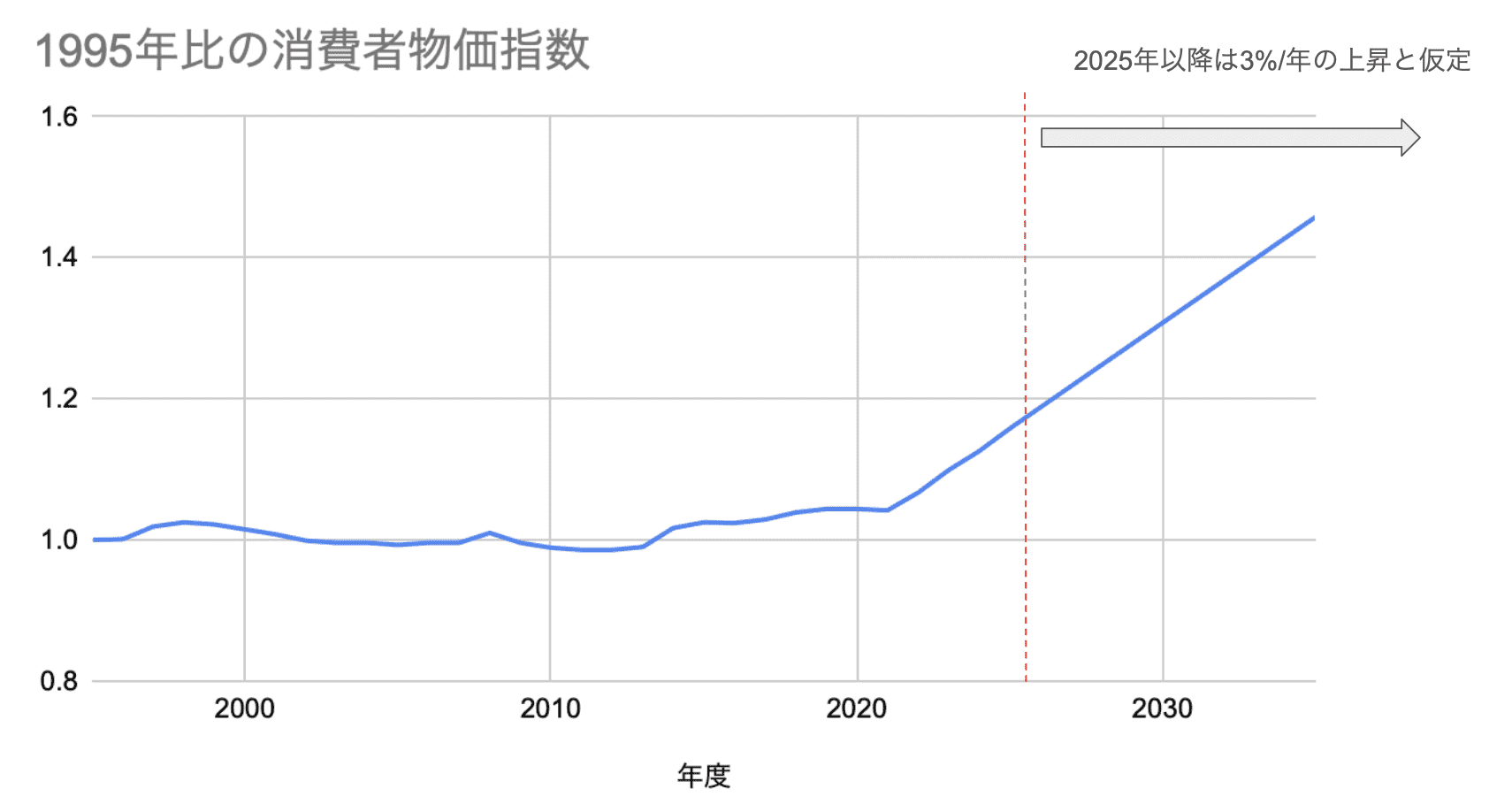 「年収1000万円」と書くと、結構多い印象を受けます。ですが、果たして本当にそうなのでしょうか?消費者物価指数を元に考えます。政府統計の年度別の総合消費者物価指数(引用1)に公表されている数値を元に1995年比での物価の上昇を図示したのが下のグラフです。1995年から2025年で物価は約1.2倍になっています。1995年に100円で買えたものが、120円になったと考えればわかりやすいと思います。