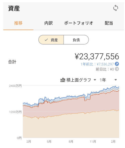 私の資産形成の状況は以下になっています。現時点で金融資産が2300万円程度です。社会人に成ってから資産形成を始めたため、平均400万円/年で積み上げている状況です。収支で振り返ると、貯蓄の寄与は平均290万円/年だったため、投資による寄与が600万円程度あります。