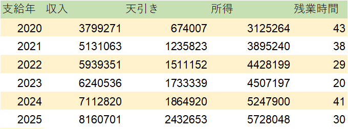 まずは工場の課長補佐(= 私)の年収推移と年収の変動に関わる変化点を示します。賃上げも相まり、順調に年収が上昇しました。入社6年で年収約800万円です。なお、福利厚生分が年額約10万円ほど入っています。残業代と昇格によりけりですが、修士卒の入社6年目だと、弊社なら600~900万円のレンジに収まります。筆者の観測では中心は700万円前後です。