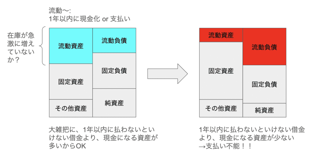 「流動資産 > 流動負債」なら、現金同等資産が流動負債よりも多くなり、問題ありません。一方、「流動資産 < 流動負債」と、現金を手元に置くための施策を打たない限り支払い能力が不足することになります。