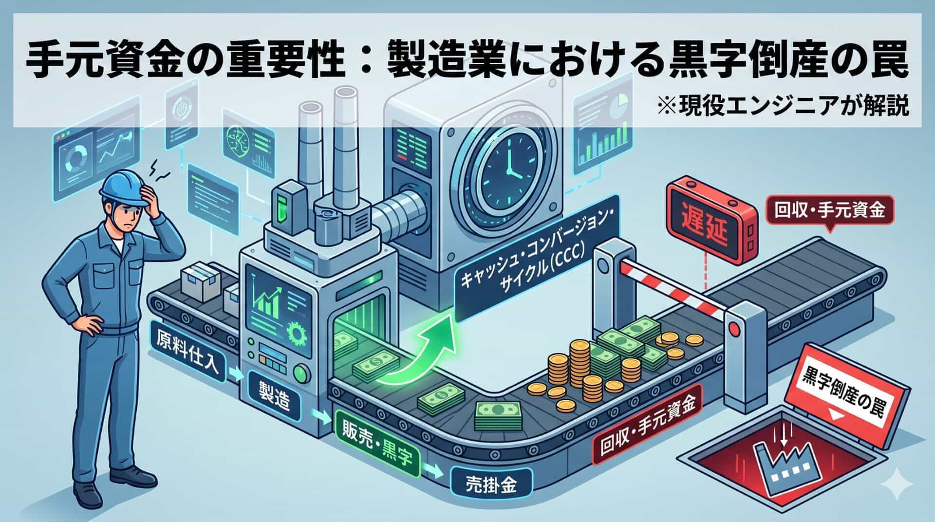 本記事では、経営における手元資金の重要性について解説します。手元資金が尽きることにより、損益計算書上は黒字であるにも関わらず倒産に至る、いわゆる黒字倒産が発生します。十分な手元資金を確保するために現役の製造エンジニアとして、化学メーカーの工場の損益の責任の一端を担って2年以上になる筆者が仕事上で重要視している指標も紹介します。