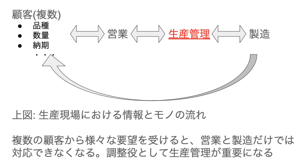 「生産管理」を説明する言葉は多くありますが、私は、「顧客納期や製品構成の要望を元に、工場のヒト・モノ・カネを適切に差配し、収益を持続的に生むための最適な資源管理をする仕事」と定義しています。基本的な機能としては、生産管理は営業から来る顧客要望と製造現場のヒトとモノの調整役を担います。顧客が1社あるいは製品が1品種ならば、営業と製造がいれば事足りますが、実際は複数の顧客に対し、複数の製品を作る必要があります。結果として、調整役としての生産管理が必要になります。そして、生産管理は単なる調整役以上の役割を求めらているのが実際です。