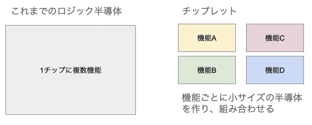ちなみに、中工程は、これまで1チップで複数機能を持たせていたものを、機能ごとのチップに分け、基板上にパッケージ化する工程を指します。機能別のチップにすることで、チップサイズが小さくなり、製造時の歩留まりの低下を防ぐことが出来るメリットがあります。結果として、これまで大チップで実現していた機能を、歩留まりよく実現できるようになります。