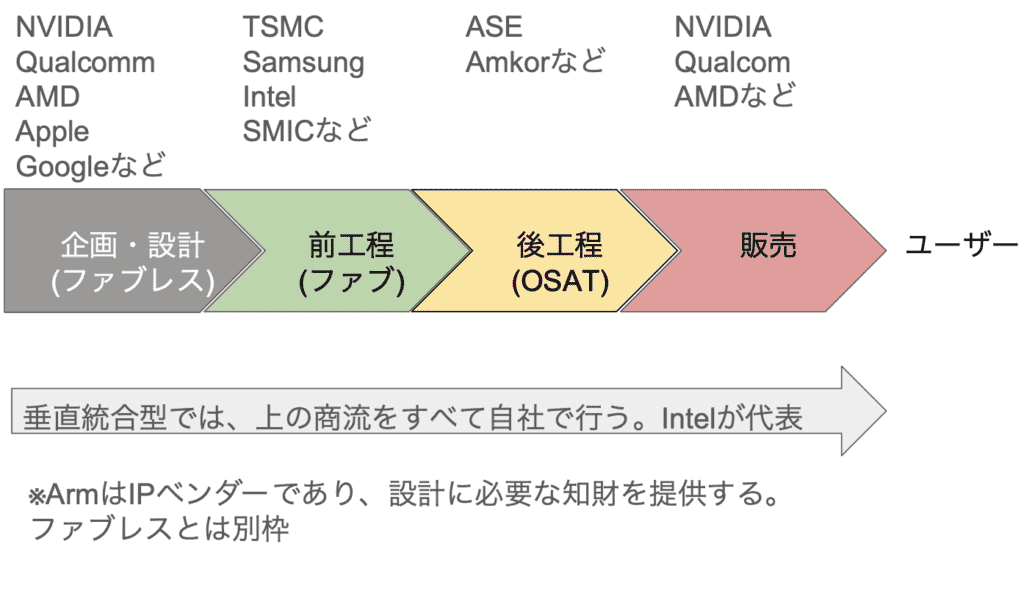垂直統合型では、半導体の設計・製造・販売まで手掛ける一方、水平分業型では、例えば設計をNVIDIA、前工程の製造をTSMC、後工程の製造は別の企業、最後の販売を再びNVIDIAが行うような形になっています。