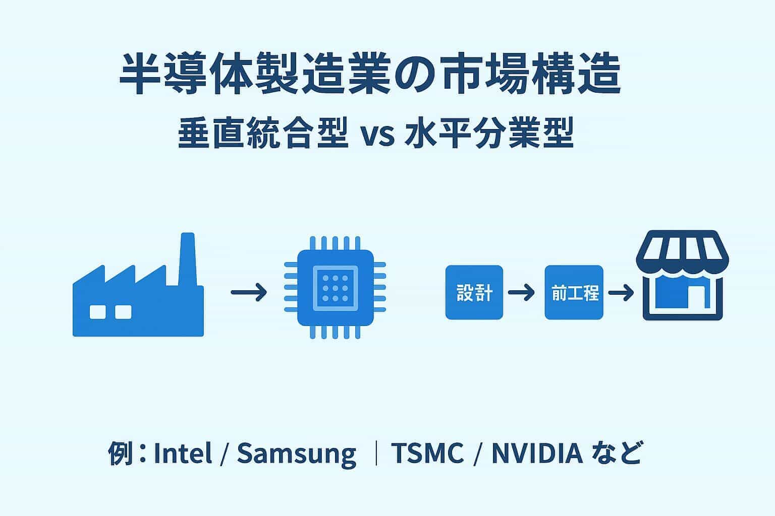 半導体製造業のビジネスモデルは、「垂直統合型」と「水平分業型」に大別できます。垂直統合型の代表は、IntelやSamsung、水平分業型の代表プレイヤーは、NVDIAやQualcom、TSMCです。